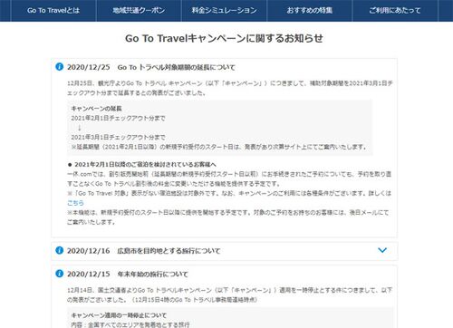 GoToトラベル、2月末までの延長を正式決定! GoToトラベル事務局は、政府の需要喚起策「GoToトラベルキャンペーン」の開催期間について、2021年2月まで現在の支援内容で延長することを事業者に宛てたメールで明らかにしました。 GoToトラベル、2月末までの延…