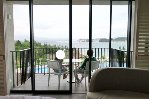 2日目③:ハレクラニ沖縄・プレミアオーシャンビュー お部屋へ スタッフさんの案内でお部屋へ向かいます。 お部屋は1年前と同じ「プレミアオーシャンビューツイン」。前回は8階でしたが、今回は5階のお部屋をアサインされました。 お部屋から玄関を見たところ…