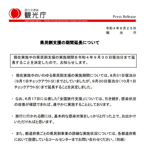 観光庁は8月25日、8月31日まで(宿泊については9月1日チェックアウト分まで)としていた県民割支援の実施期間を再延長することを発表しました。当初7月前半から開始することを想定していた全国旅行支援については、引き続き延期するとしています。 県民割支…