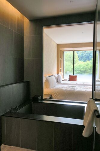客室:プレミアデラックスツイン(前半) お部屋へ ROKU KYOTO, LXR Hotels & ResortsのエクスペリエンスであるTreasure Huntingを楽しんだ後、お部屋の鍵をもらいました。スタッフさんに館内を案内していただきながらお部屋へ。