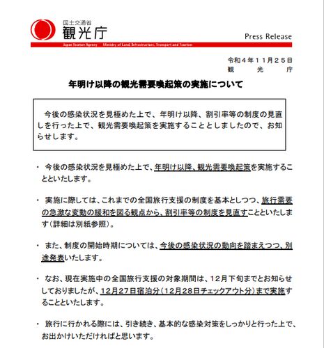 斉藤国土交通大臣は11月25日の閣議後の会見で、新型コロナの感染状況を見極めたうえで「全国旅行支援」を年明け以降も継続することを明らかにしました。年内は12月27日の宿泊分までとして、年明けの開始時期は今後決定するとしています。 2022年の全国旅行支…