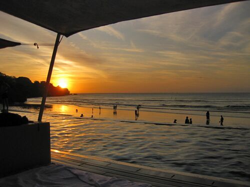 5日目⑥:ジンバランビーチと夕食 ジンバランビーチへ ビーチクラブ・スンダラからビーチへは、階段で降りることができます。 ちょうど階段の前を馬が通り過ぎていきます。
