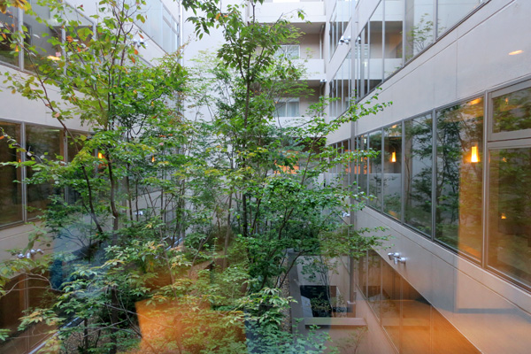 フロントは吹き抜けになっていて解放感があります。東山地区で周りには建物が多いのですが、フロントから見えるちょっとしたお庭に癒されます。