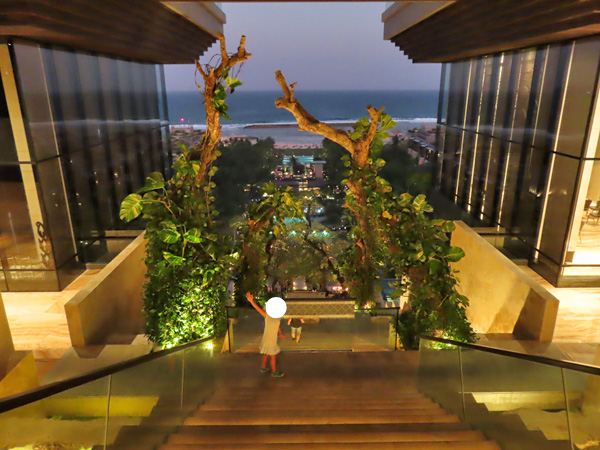 この階段をすべて上るのは大変ですが、下りるのは大変ではありません。が…それなりに階段が急なので、子供たちが転げ落ちないかヒヤヒヤ。途中途中でパネルや植木があるので、上から下まで転げ落ちることはありません。