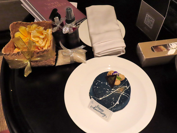 そういえば結婚記念日の旅行だと伝えていたんだった!ケーキとプルメリアのお花、スパプロダクツのプレゼントがありました。