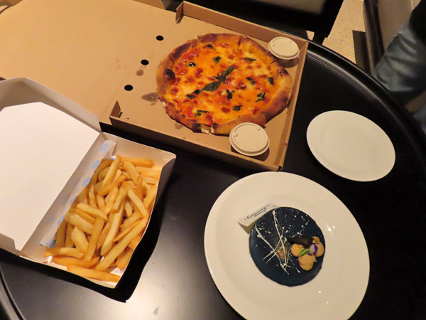 今日はこのケーキもあるし、インルームダイニングで夕食にすることにして電話で注文。40分後くらいにやってきましたー。