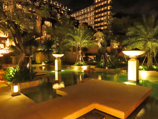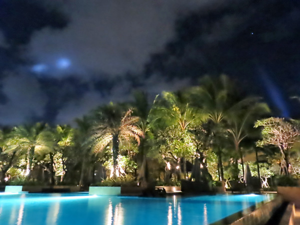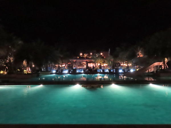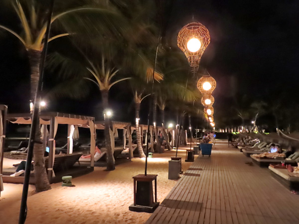 光をよく見てみようとリーフビーチクラブのほうへ行ってみたのですが…。夜にも関わらず、こちらのデッキチェアやガバナはすべて埋まっています。